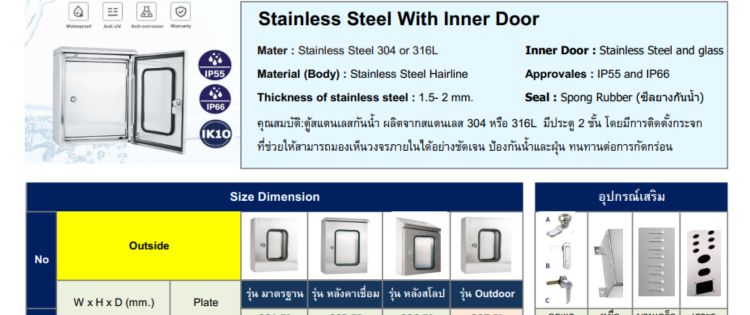 ความทนทานต่อการกัดกร่อนแล้วตู้ไฟ 2 ชั้น ยังช่วยปกป้องอุปกรณ์ไฟฟ้าภายในจากฝุ่นละออง ความชื้น และสิ่งสกปรกได้อย่างมีประสิทธิภาพ ด้วยโครงสร้างแบบ 2 ชั้น ทำให้มีฉนวนป้องกันอุณหภูมิภายใน ลดผลกระทบจากความร้อนหรืออากาศภายนอก เหมาะสำหรับการติดตั้งใน โรงงานอุตสาหกรรม, อาคารพาณิชย์, ศูนย์ข้อมูล และสถานที่ที่มีสภาพแวดล้อมรุนแรง สามารถเลือกเป็นบานทึบหรือบานกระจกนิรภัย เพื่อให้ตรวจสอบการทำงานของอุปกรณ์ภายในได้ง่ายยิ่งขึ้น ผลิตจาก สแตนเลสเกรด 304 หรือ 316L ซึ่งให้ความแข็งแรงสูงและ ป้องกันสนิมได้ดีเยี่ยม แม้ใช้งานในพื้นที่ที่มีความชื้นหรือสารเคมี เช่น โรงงานอาหาร, โรงพยาบาล, และอุตสาหกรรมเคมี โครงสร้าง 2 ชั้น ช่วยเสริมความแข็งแรง ป้องกันแรงกระแทกและลดการสะสมความร้อนภายใน รองรับมาตรฐาน IP55 – IP66 ป้องกันน้ำและฝุ่นได้ดี ติดตั้งได้ทั้ง กลางแจ้งและในอาคาร ช่วยยืดอายุการใช้งานของอุปกรณ์ไฟฟ้าภายในให้ยาวนานถึง 10-20 ปี