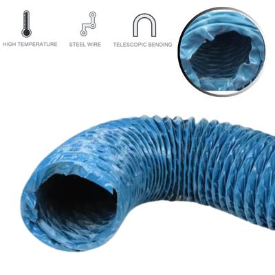 ท่อส่งลมยืดหยุ่นสำหรับงานระบายอากาศทั่วไปในอุตสาหกรรมและงานก่อสร้าง ผลิตจากผ้าใบทาร์โพลีนเคลือบ PVC เสริมด้วย ขดลวดสปริงโลหะภายใน ทำให้ท่อ โค้งงอ พับเก็บ และปรับทิศทางได้ง่ายโดยไม่เสียรูปทรง ทนต่ออุณหภูมิ -20°C ถึง 120°C – เหมาะกับงานระบายลมร้อน–ลมเย็นทั่วไป
