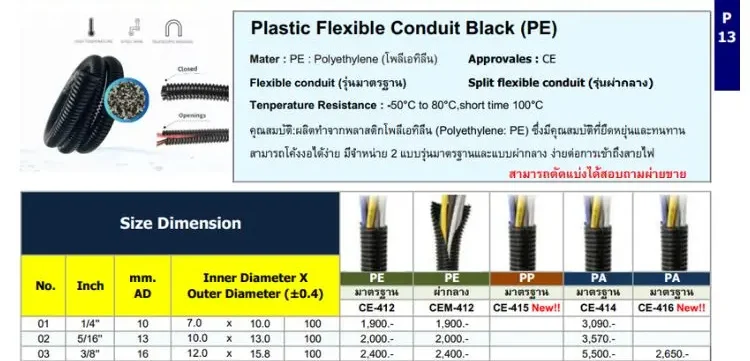 ท่อกระดูกงูแบบผ่า/ไม่ผ่า หรือ ท่อร้อยสายไฟ PE คือ ท่อเฟล็กซ์ที่ผลิตทำจากพลาสติกโพลีเอทิลีน (Polyethylene: PE) ซึ่งมีคุณสมบัติที่ยืดหยุ่นและทนทาน สามารถโค้งงอได้ง่าย ทำให้เหมาะสำหรับการติดตั้งในที่ที่มีการโค้งหรือพื้นที่ที่ยากต่อการติดตั้ง จัดเก็บสายไฟในรถ งานไฟฟ้า เครื่องจักร และการเดินระบบไฟฟ้า ป้องกันน้ำและฝุ่นเข้าสู่ภายในท่อ