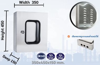 ด้วยขนาด 350x450x150 มม. ตู้รุ่นนี้เหมาะกับทั้งงานติดตั้ง ภายในโรงงาน อาคารสำนักงาน พื้นที่ควบคุมกลางแจ้ง รวมถึงโครงการสาธารณูปโภคที่ต้องมีการตรวจสอบระบบไฟฟ้าเป็นประจำ เช่น ตู้ควบคุมไฟส่องสว่าง ตู้ควบคุมปั๊มน้ำ หรือตู้แสดงผลค่าการทำงานของเครื่องจักรในสายการผลิต